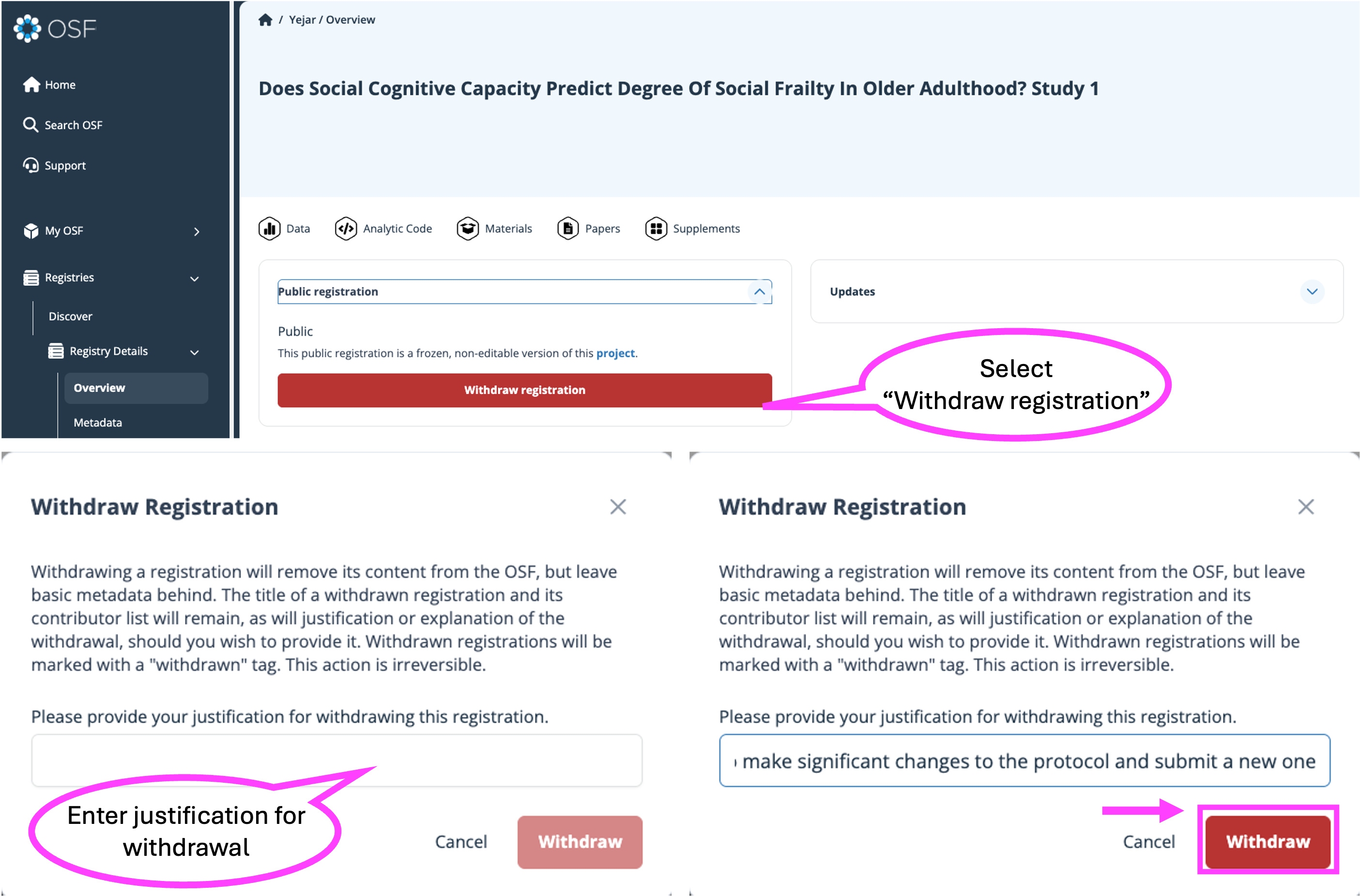 Withdrawing a registration removes its contents from the OSF. Withdrawn registrations will maintain basic metadata (e.g. title, contributors, DOI, etc.) about the registration, as well as a justification for its withdrawal, but the registration form, files, and other content will be removed. Please note that registration withdrawal is irreversible.