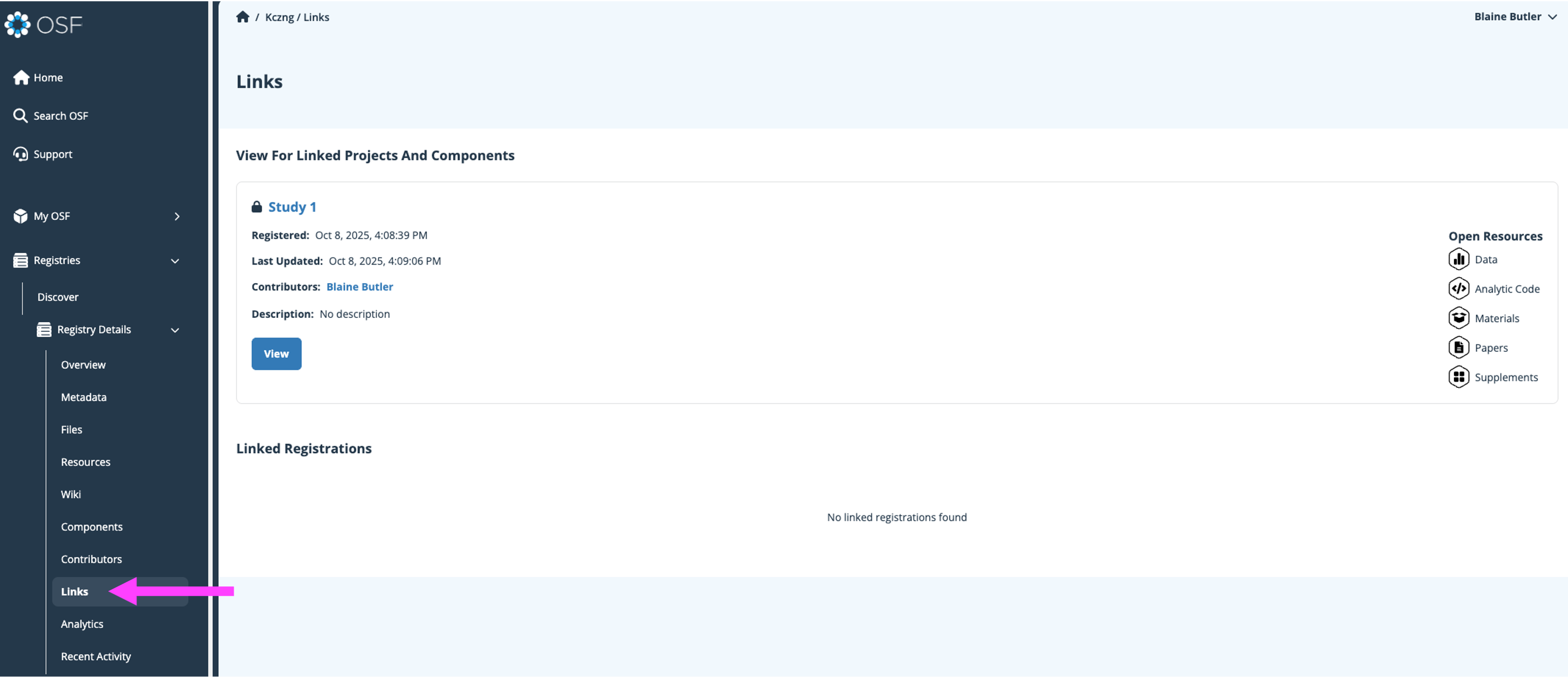 If you link projects or registrations to an OSF project, these links are also available on the registration when it is published. These links cannot be modified later, and changes to the links on the original project are not reflected on the registration.