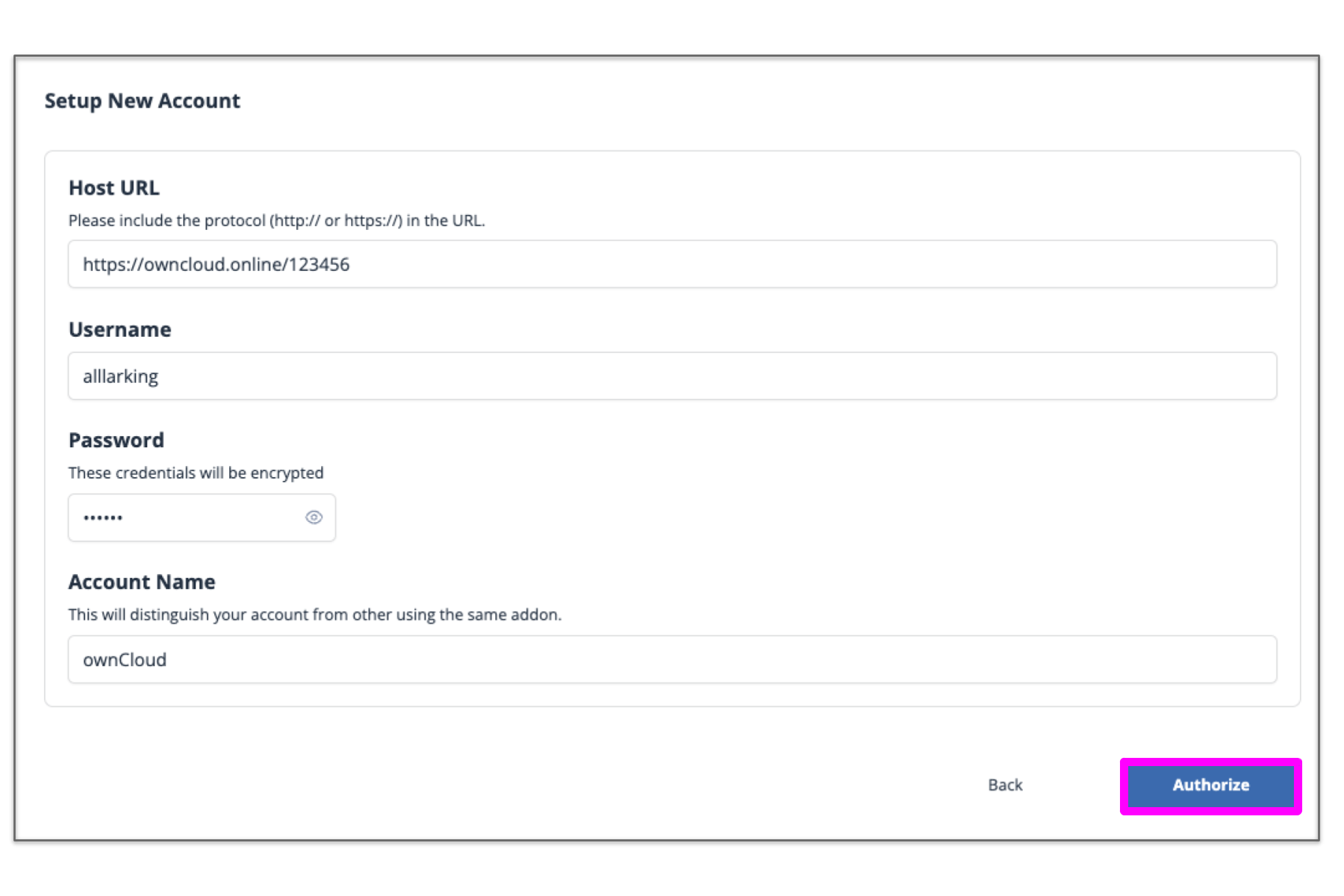 Because other contributors can connect their add-on accounts to a shared project, you'll be prompted to provide a unique name for your account.