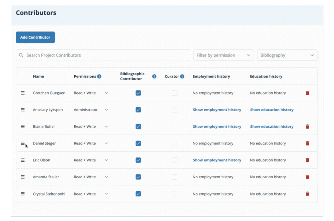 - If the contributor will be included in the bibliographic citation when submitted. Contributors with a blue check mark icon are included in the citation.