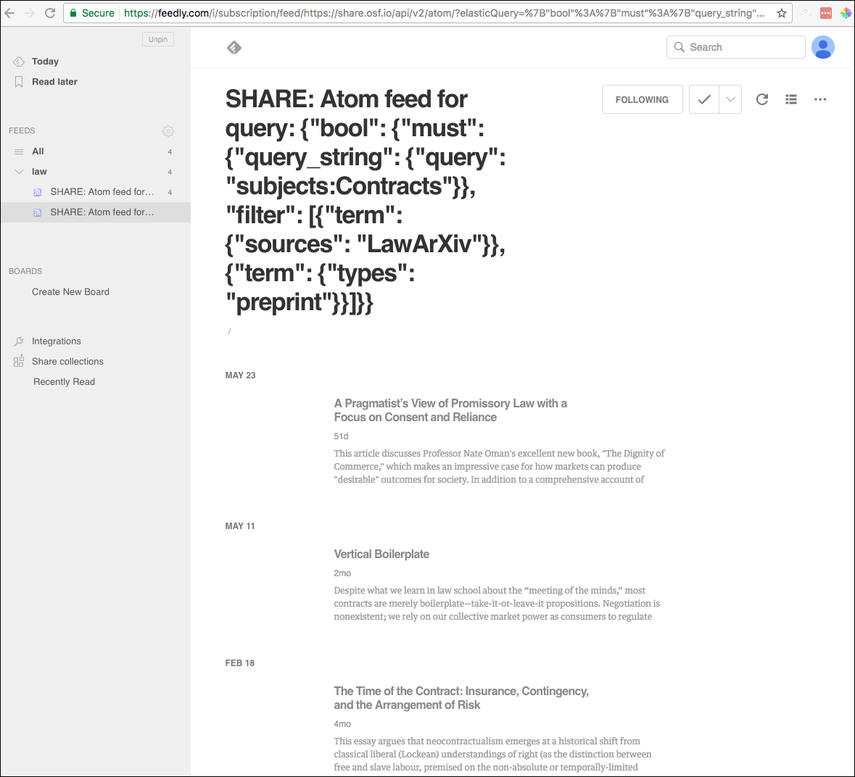 Using an RSS feed, you can receive updates when new preprints are added to a preprint provider. Once you've generated the RSS feed, you will need to use a feed aggregator, such as Feedly to receive updates.
