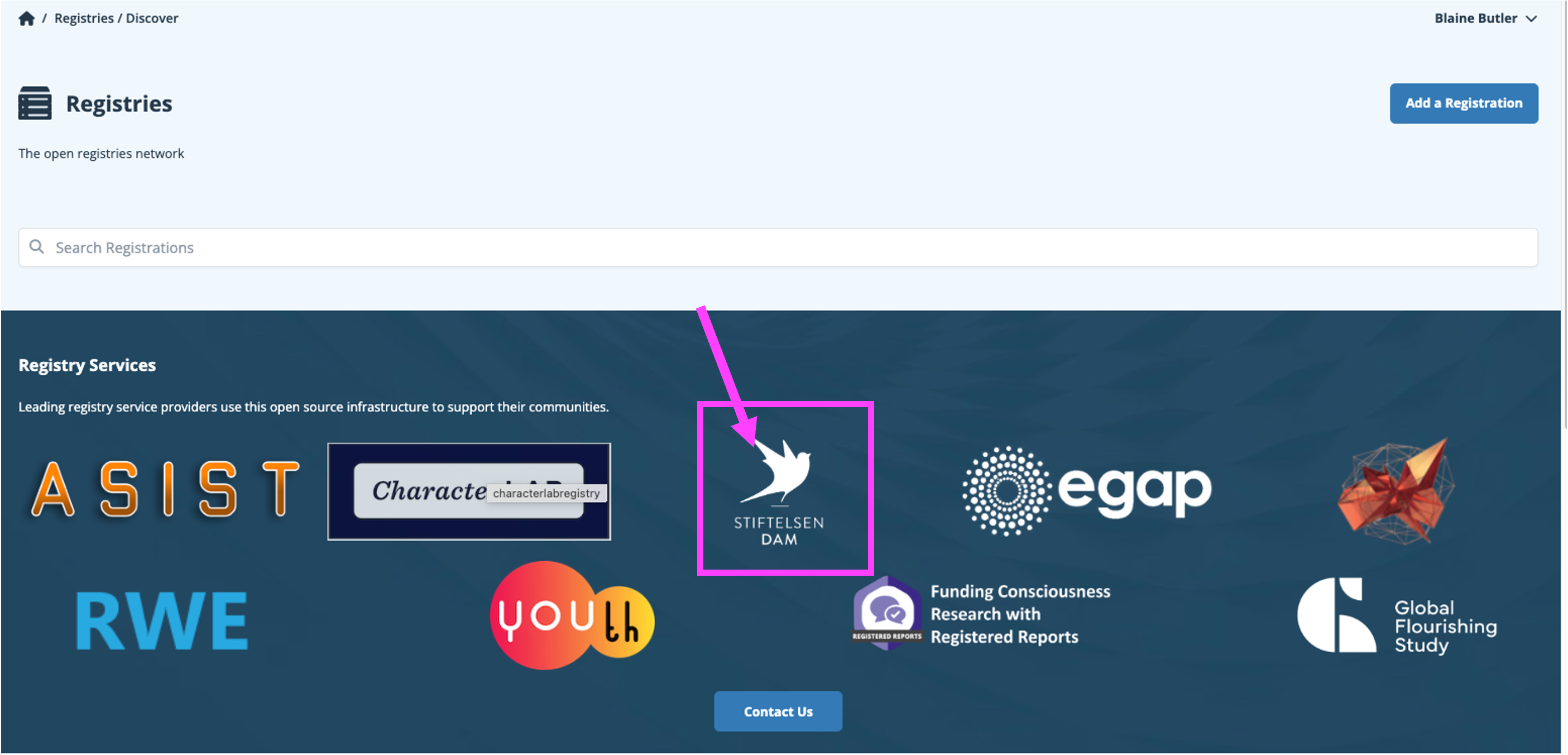 You can start a registration from the Registry Discover Page OR from your My OSF, “My Registrations” page. IF you are submitting your registration to a Community-run Registry such as Stiftelsen DAM, Global Flourishing Studies (GFS), or Real World Evidence (RWE) please see the section on Submit to a Community-run Registry.