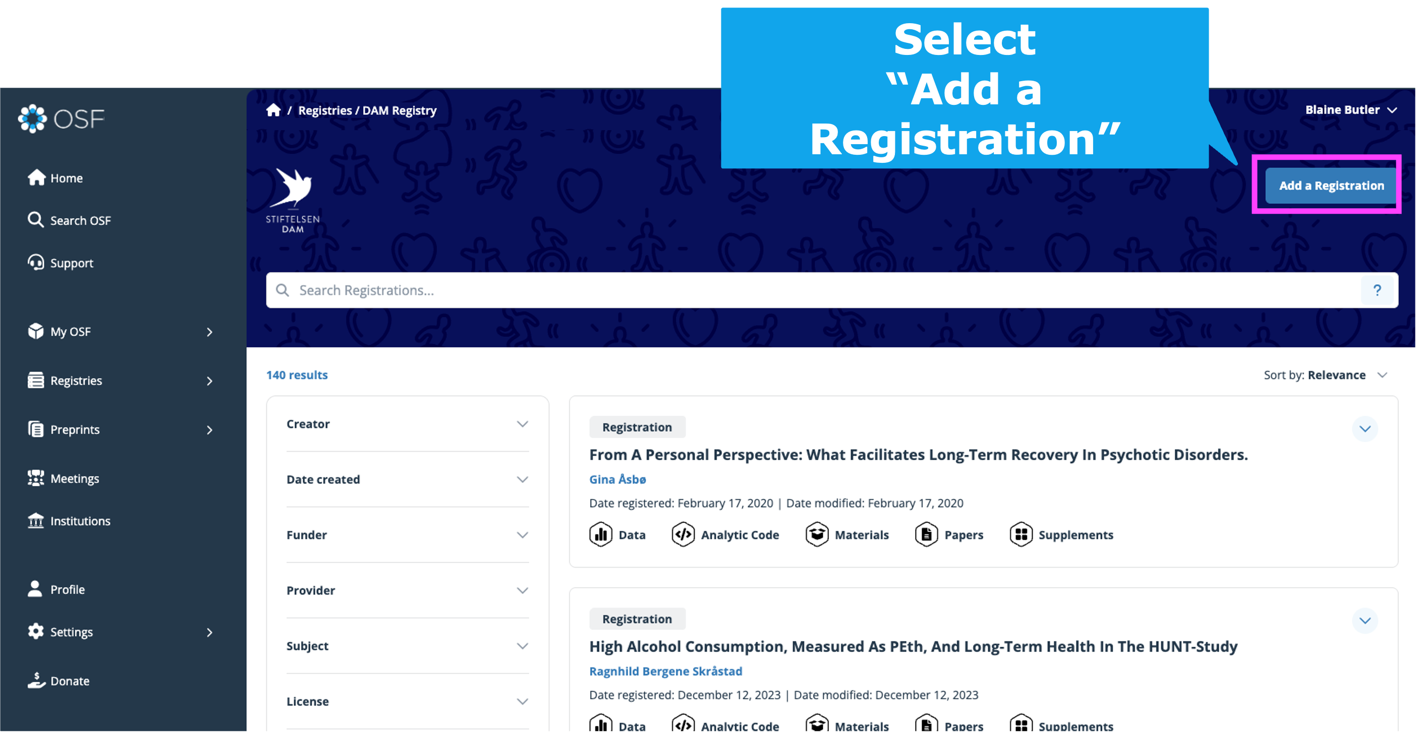 From your OSF dashboard (Home), navigate to your “My Registrations” page, select “My OSF” and then “My Registrations”. Your “My Registrations" page will appear.