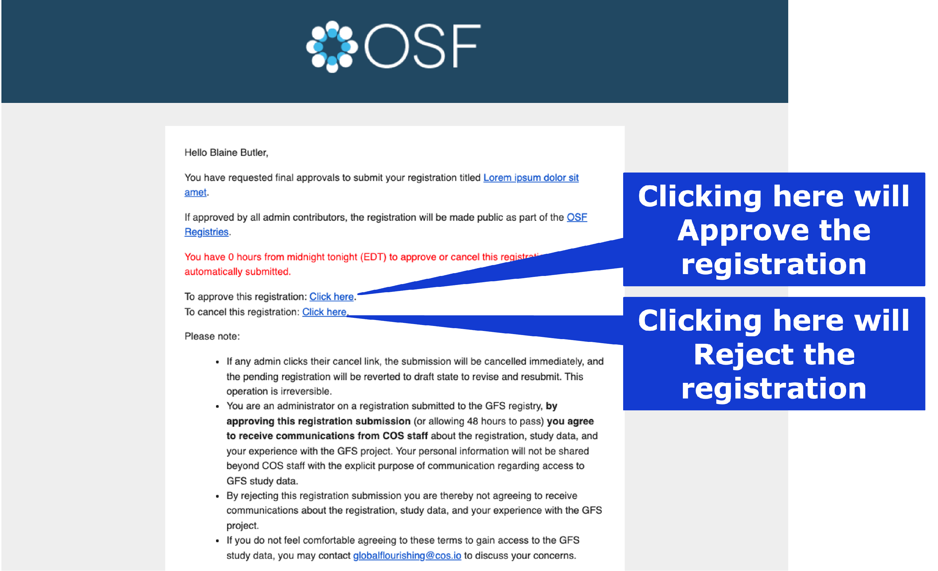 Registrations that are not submitted to a Community-run Registry are reviewed and approved by the administrators on the registration. This approval process will be sent to each administrator on the registration in an email sent upon submission.