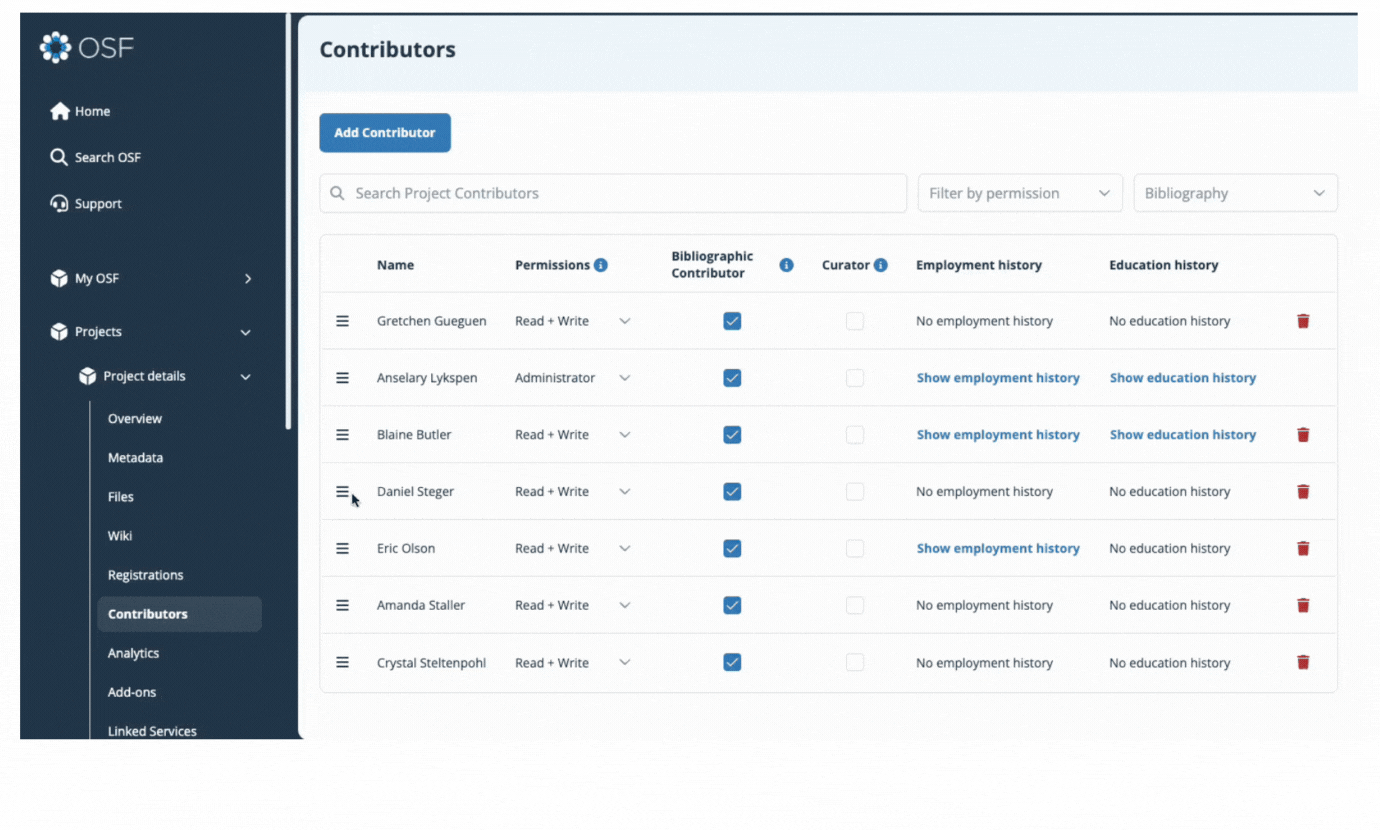 OSF projects come with a suite of tools designed to help you organize, collaborate, document, and share your research. Below, you’ll find detailed steps on how to access each tool, an overview of what the tool does, and common use cases to help you understand how it fits into your workflow.