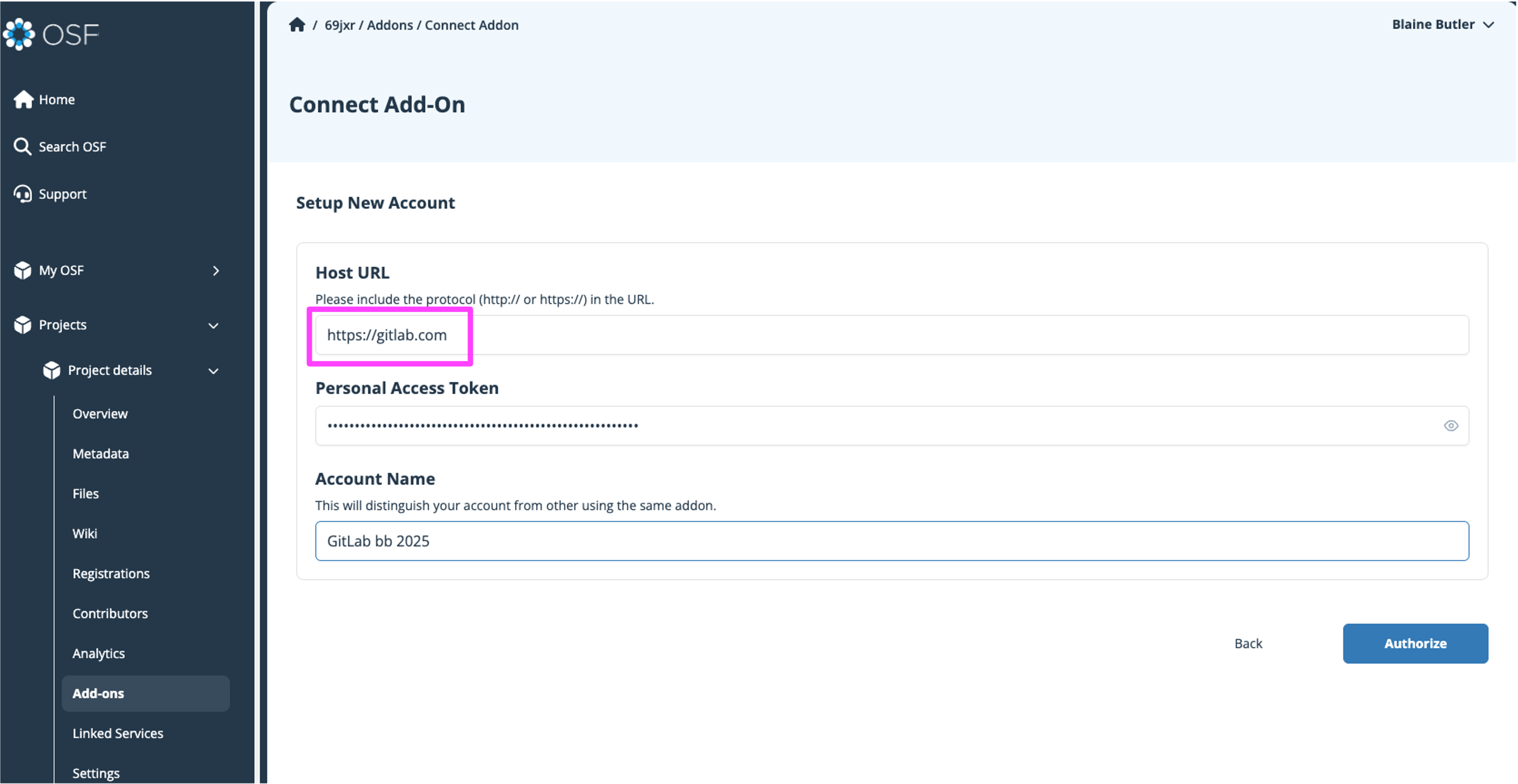 Because other contributors can connect their add-on accounts to a shared project, you'll be prompted to provide a unique name for your account.