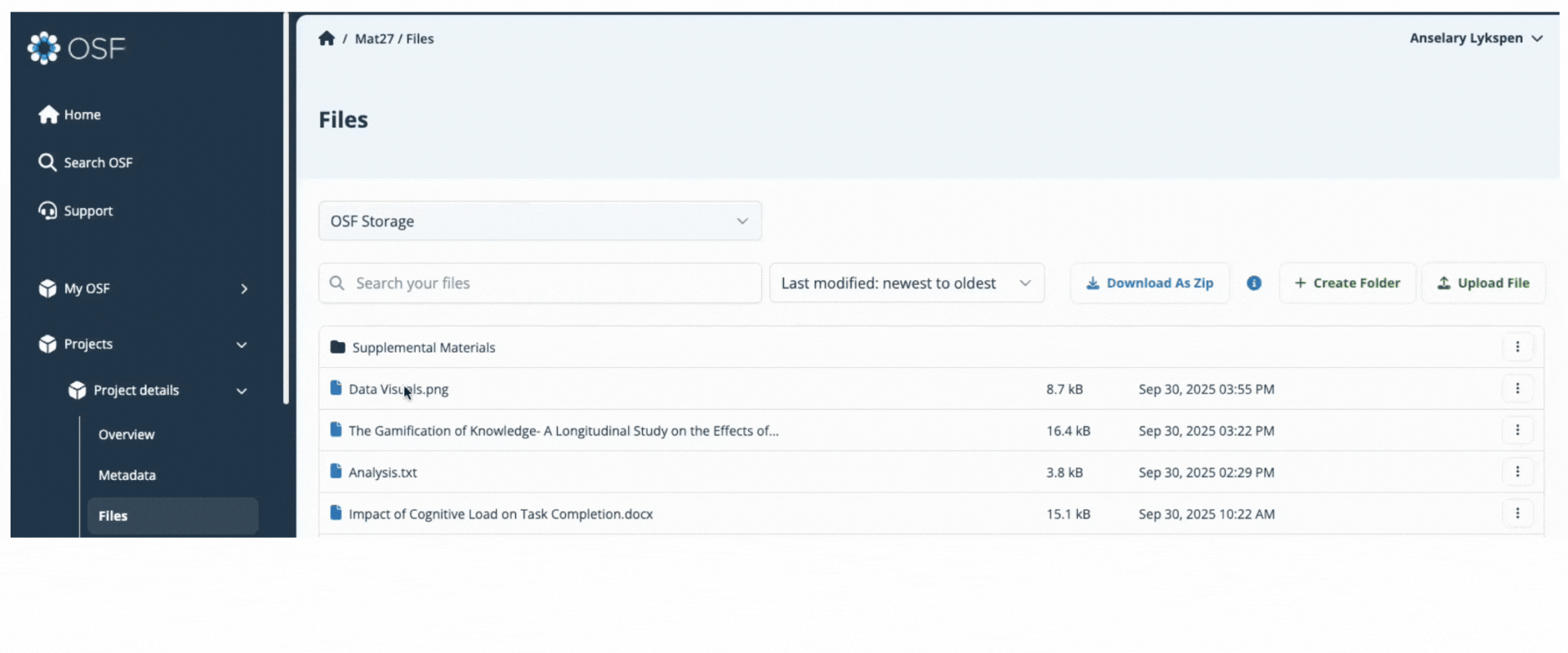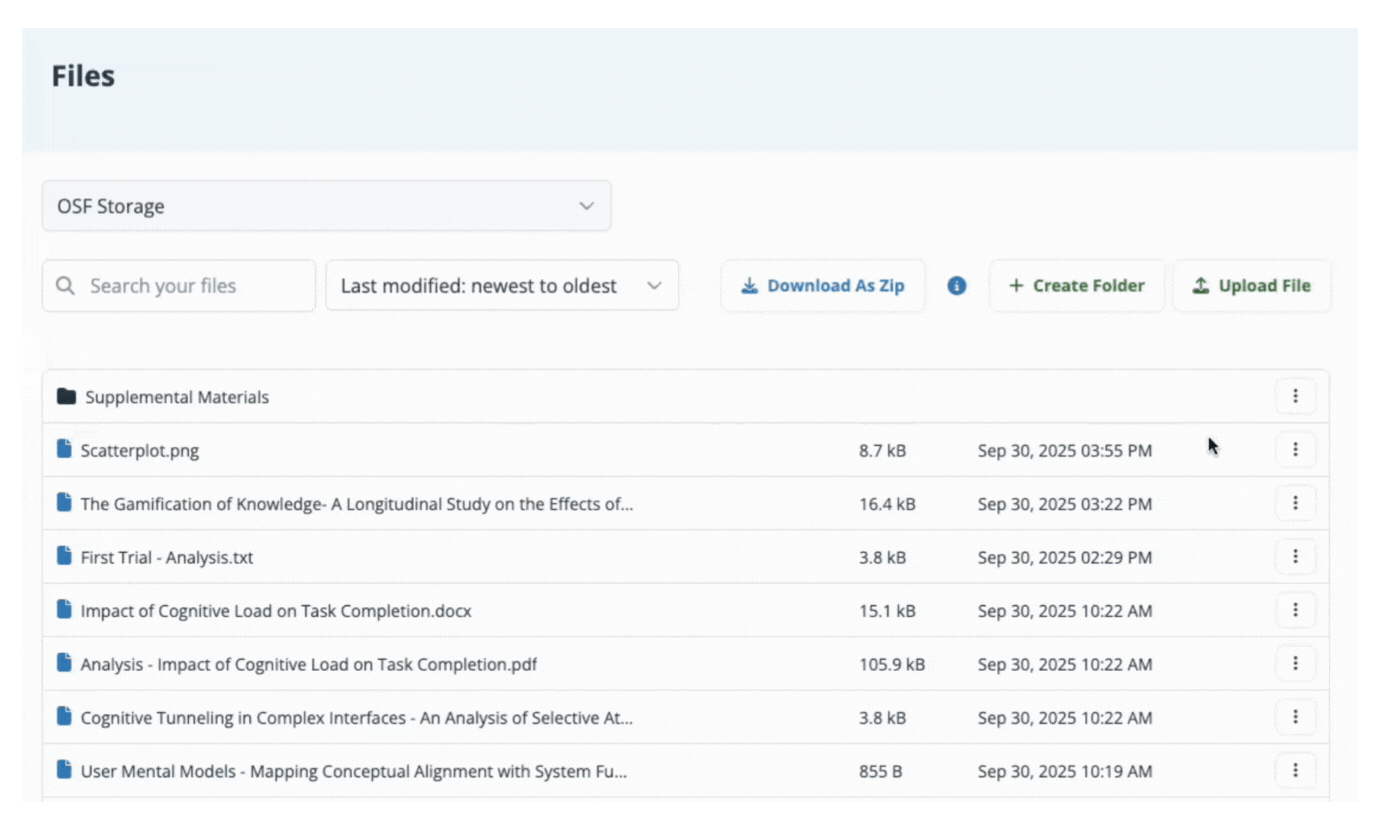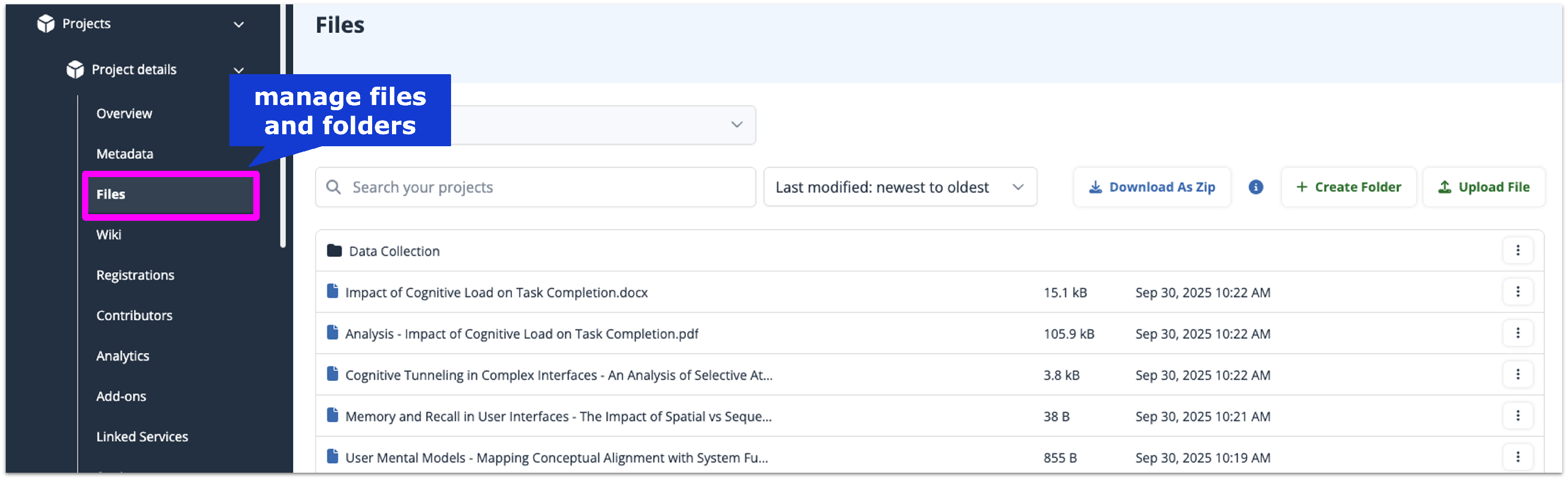 The Files section of your project is an excellent place to hold all of your data, analysis, notes and other research materials. This guide focuses on Project files. Files functionality is different for OSF Registrations and Preprints.