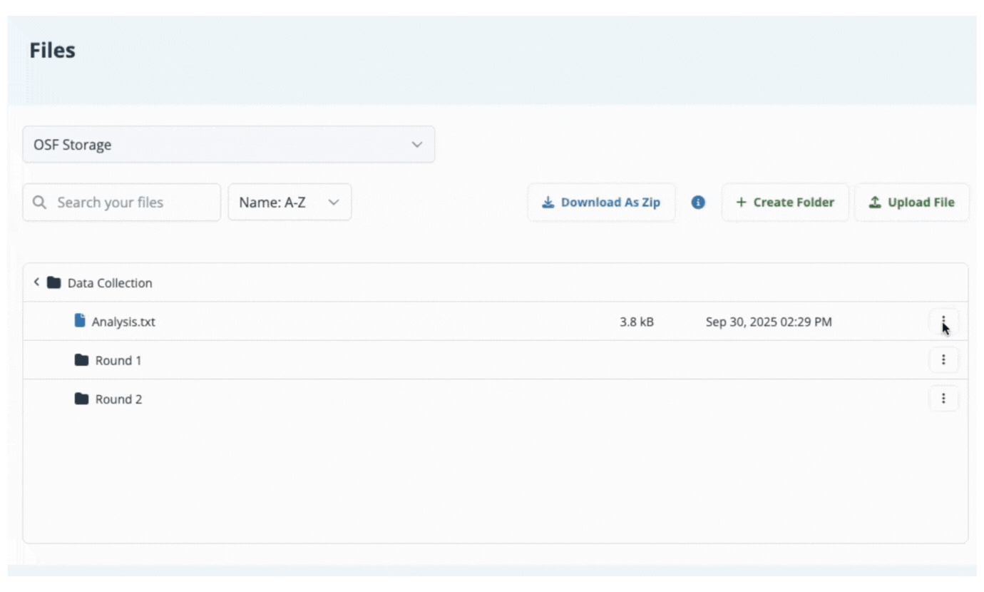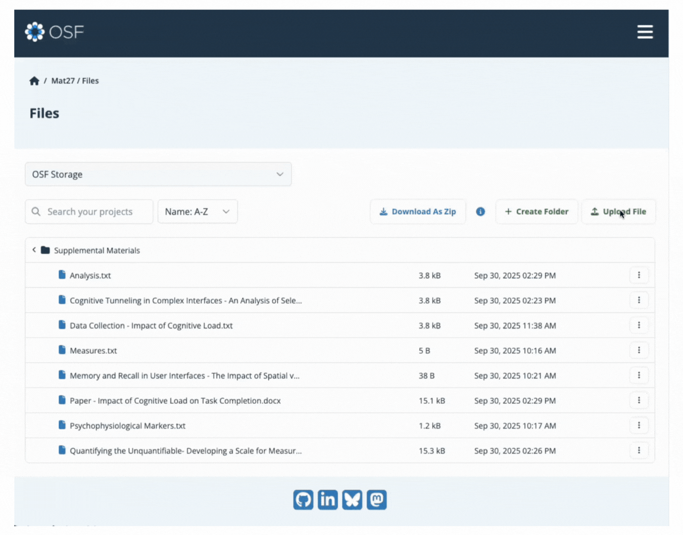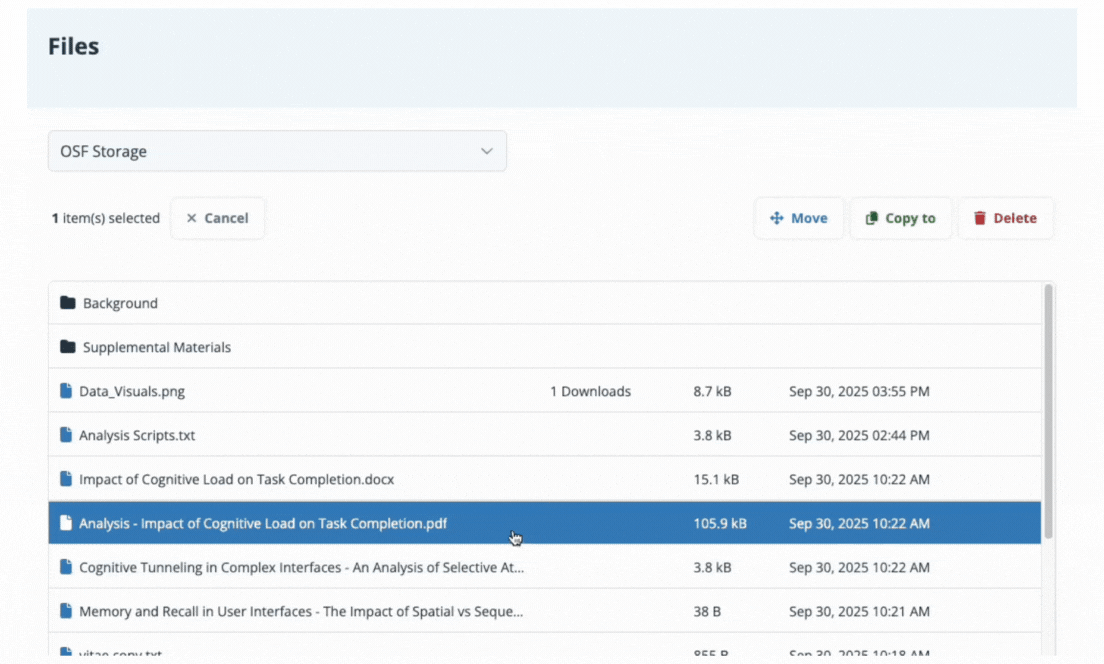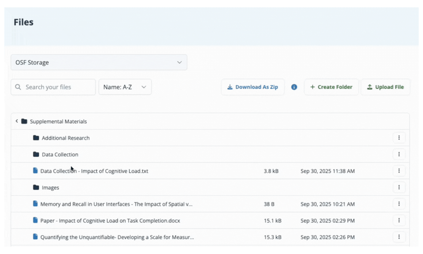 The Files section of your project is an excellent place to hold all of your data, analysis, notes and other research materials. This guide focuses on Project files. Files functionality is different for OSF Registrations and Preprints.