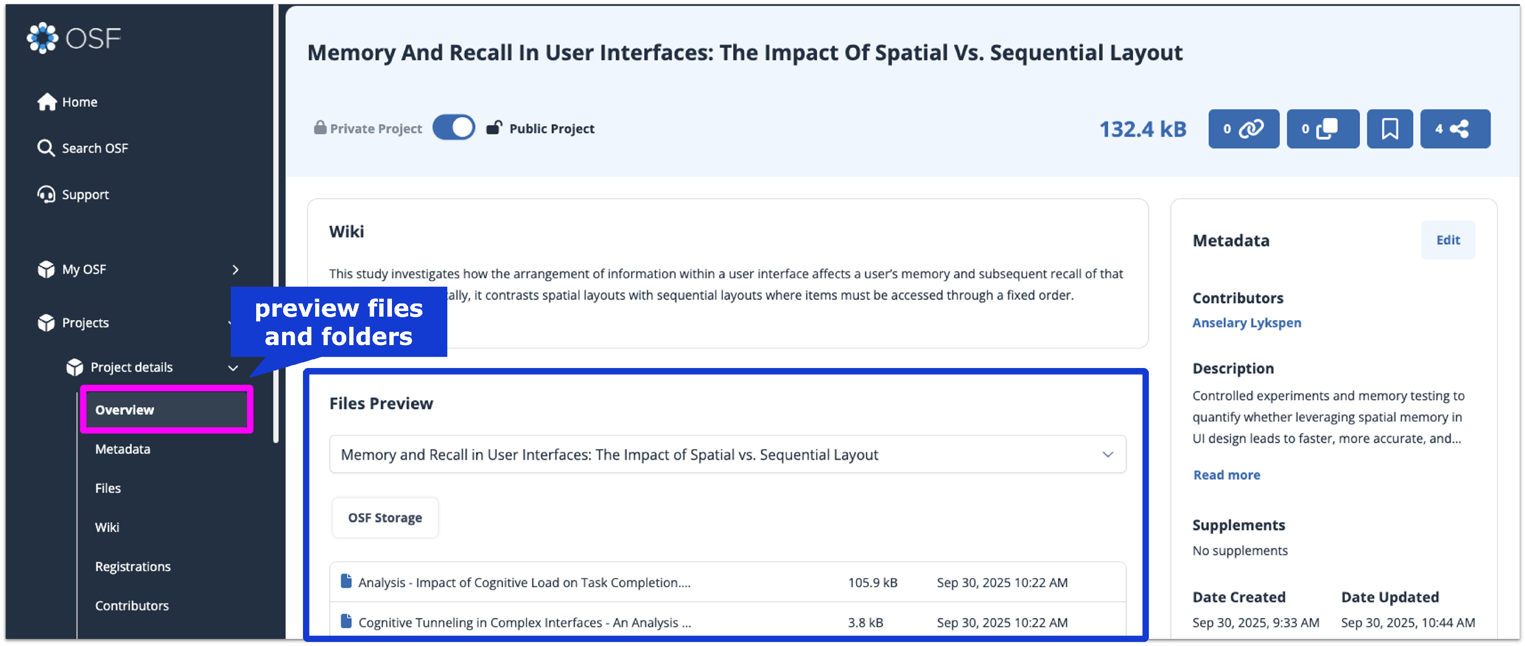 Files in OSF are always related to projects, registrations, or preprints, which have their own metadata as well. Because of this relationship, you do not need to repeat this information for every file. Instead, you can concentrate on just the information that will uniquely apply to each file: the type of material, its language (if applicable), a description, and a title (if it is different from the file name).