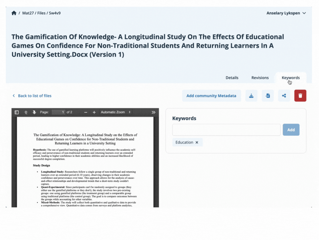 Importantly, the Details tab is where you can view/update File Metadata and File Community Metadata, if desired. See Add Metadata to a File for details.