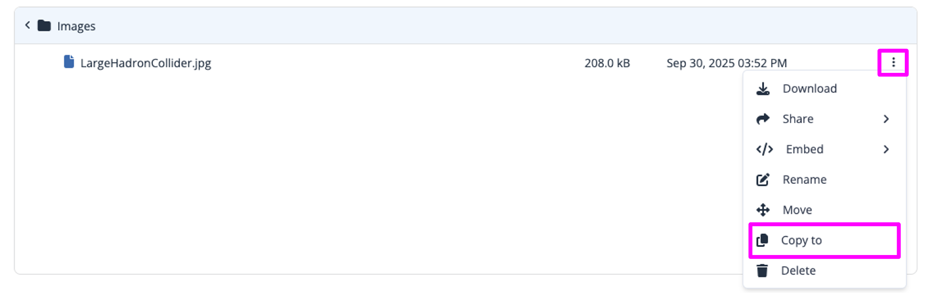Click the three dots to the right of a folder or file name to reveal options to Download, Rename, Move, Copy, and Delete.