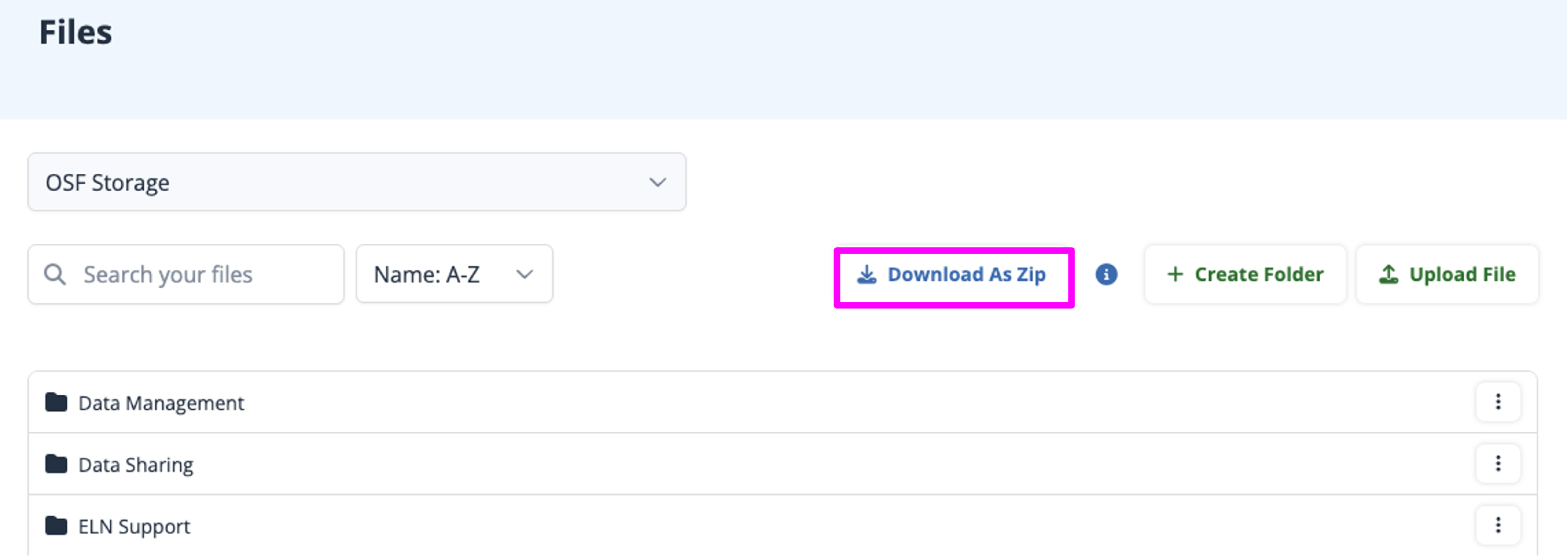 - Download everything in a storage provider, such as OSF Storage: navigate to the root or top level, and click Download As Zip.