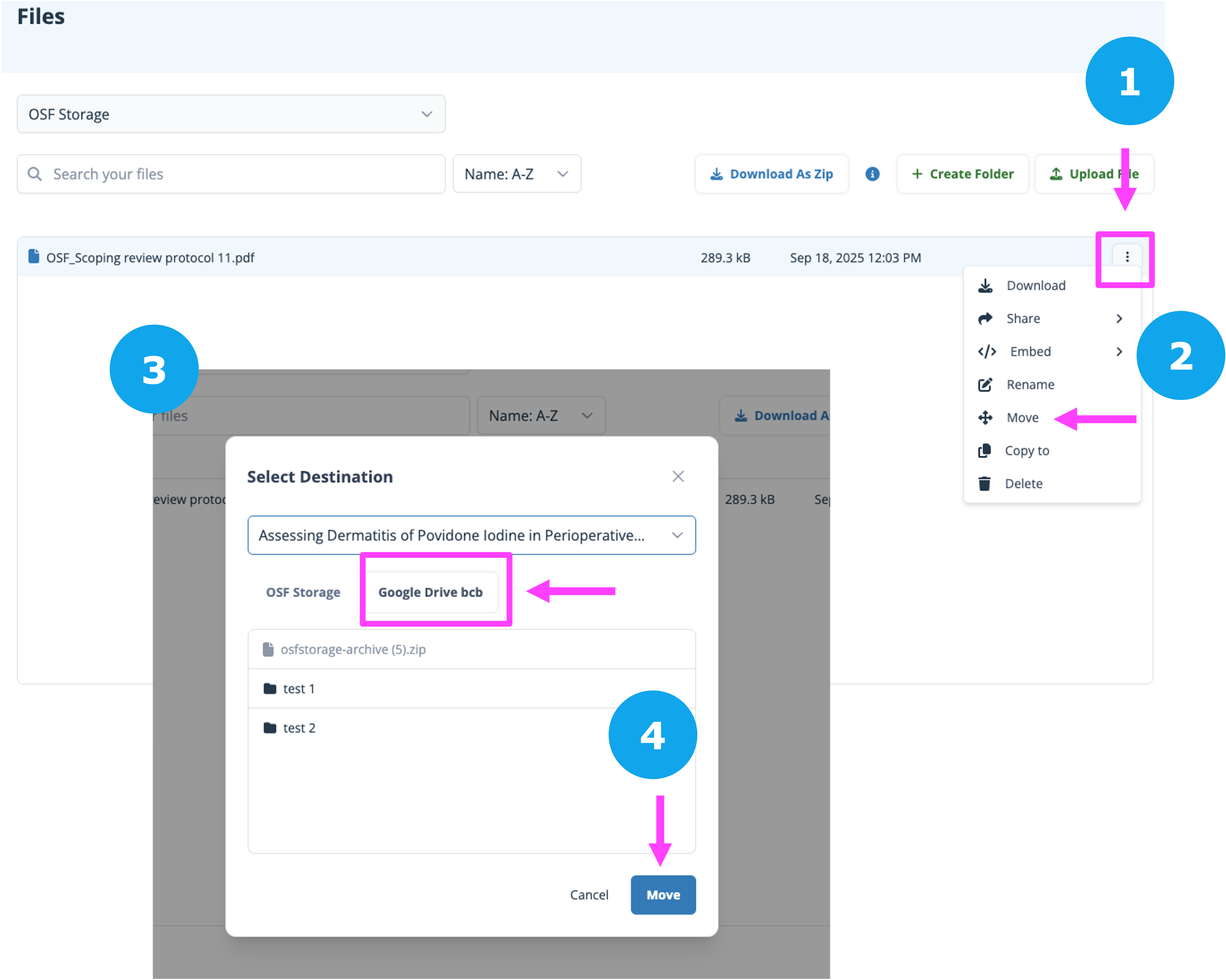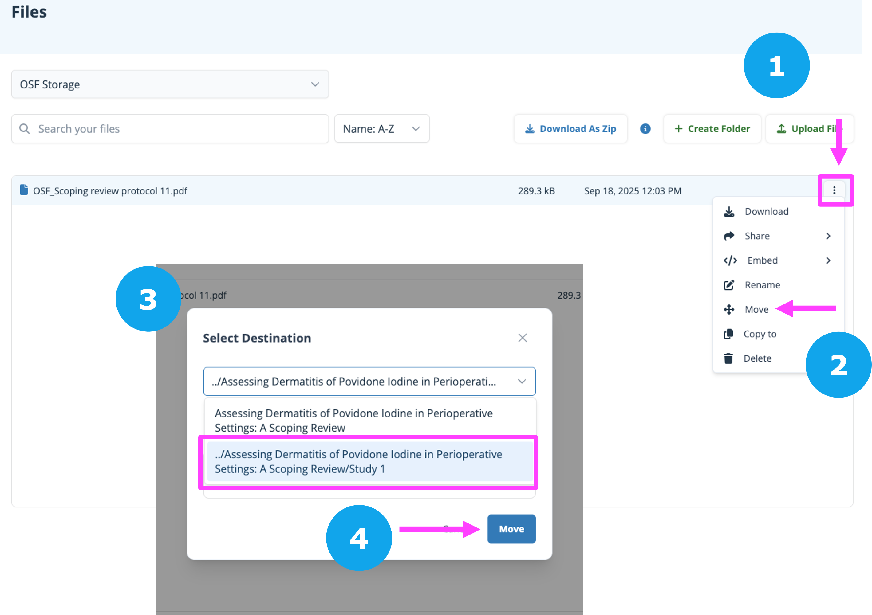 From the Files Interface, click the three dots to the right of a folder or file name. 1) Select the option to Move.