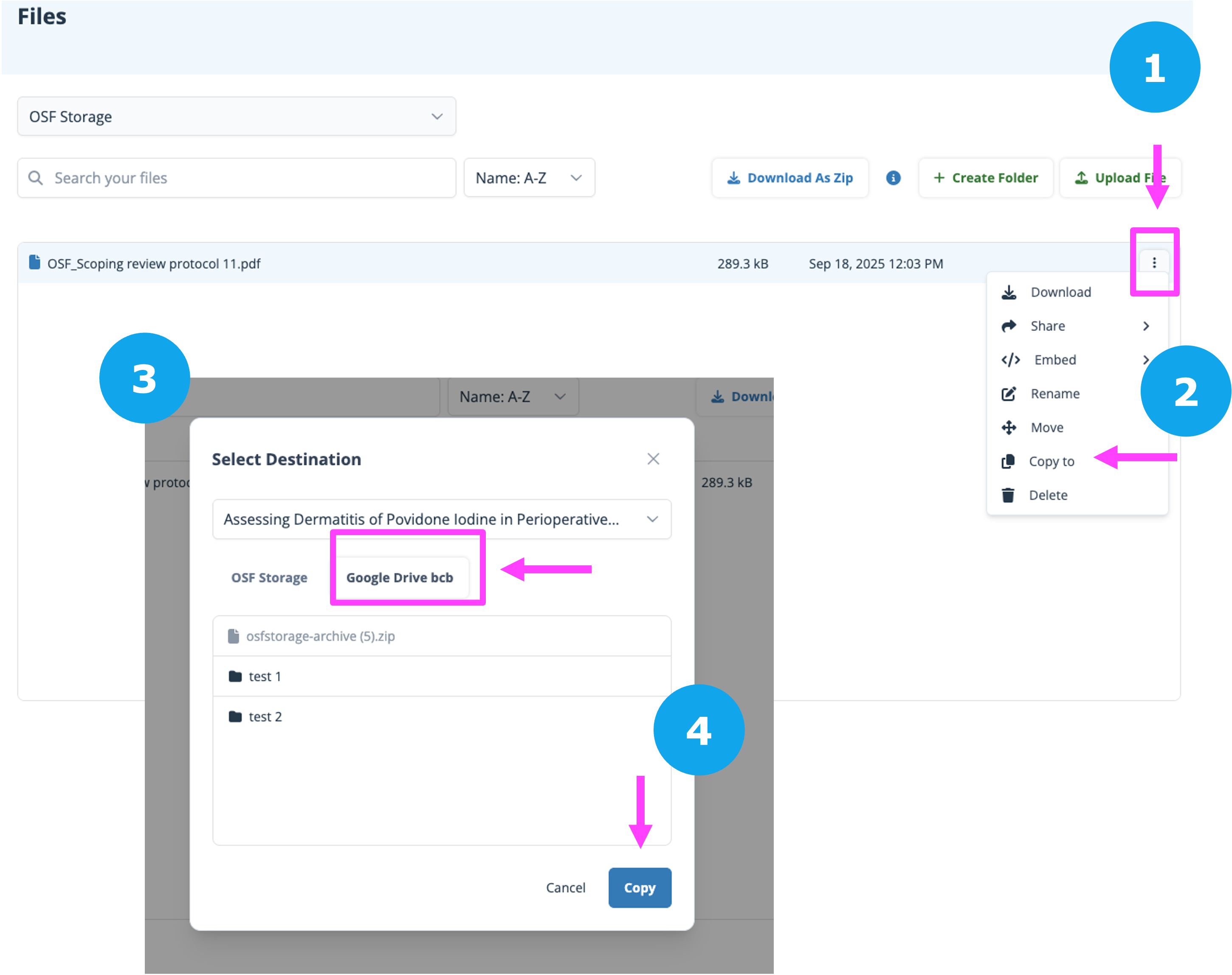 From the Files Interface, click the three dots to the right of a folder or file name. Select the option to Copy. Select your destination in the dialog box.