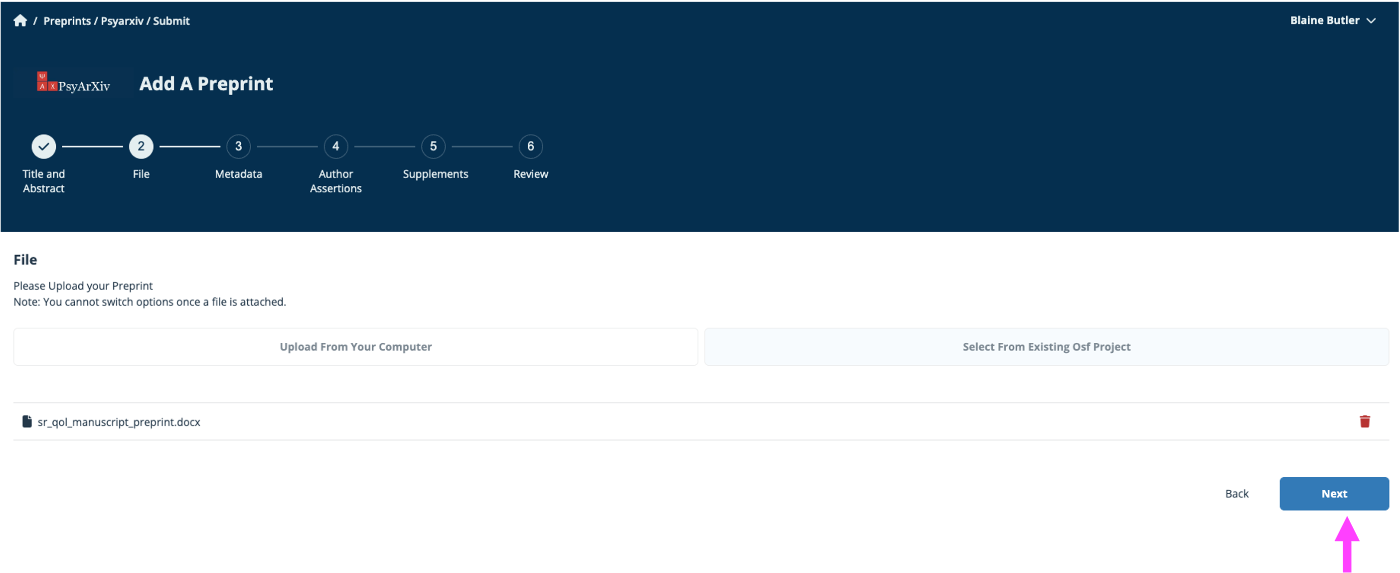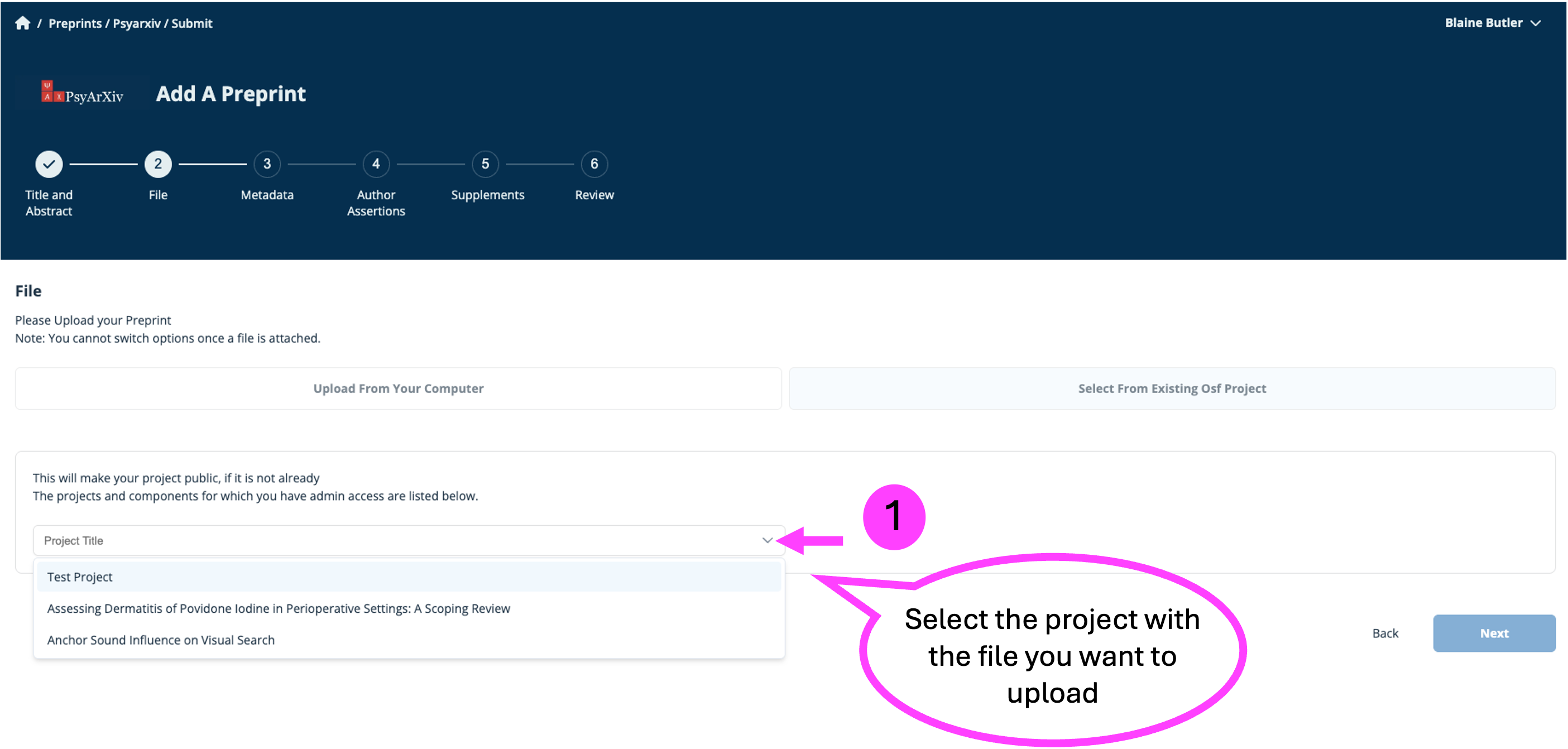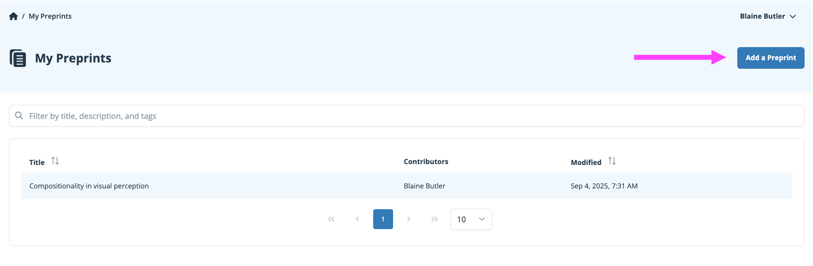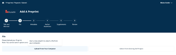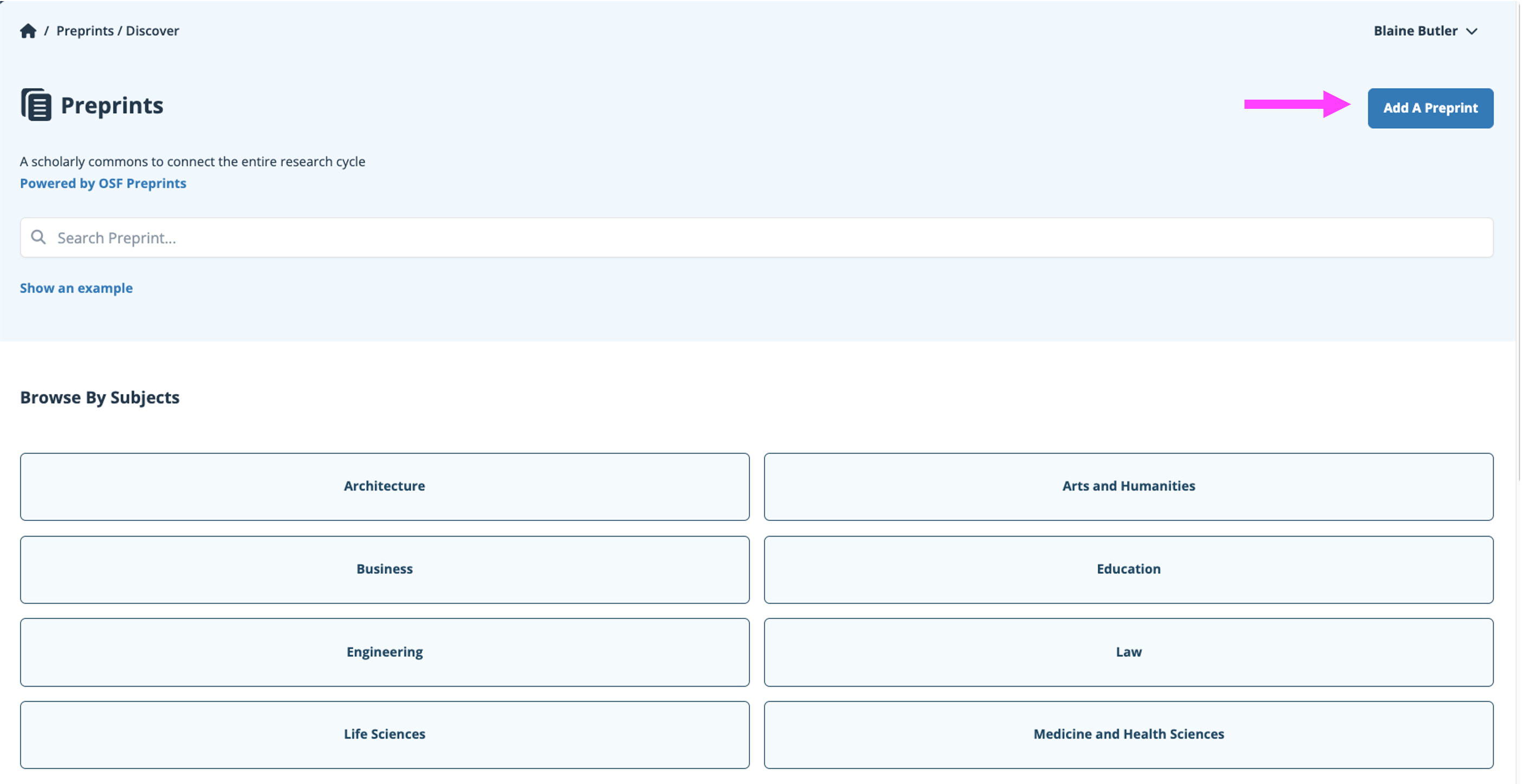 You can select a preprint service either from the preprint discover page by clicking the “Add a Preprint” tab found at the top of the preprint discover page: