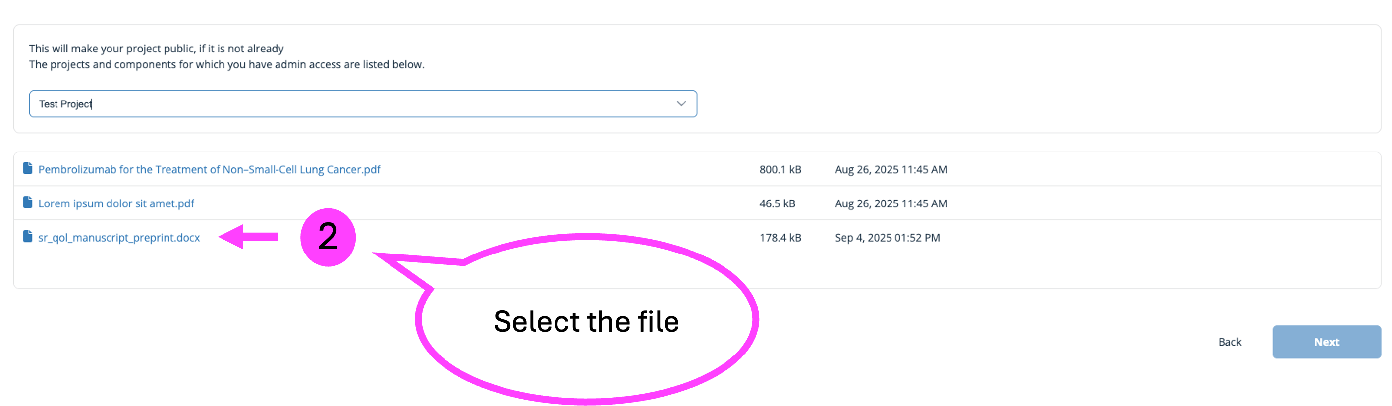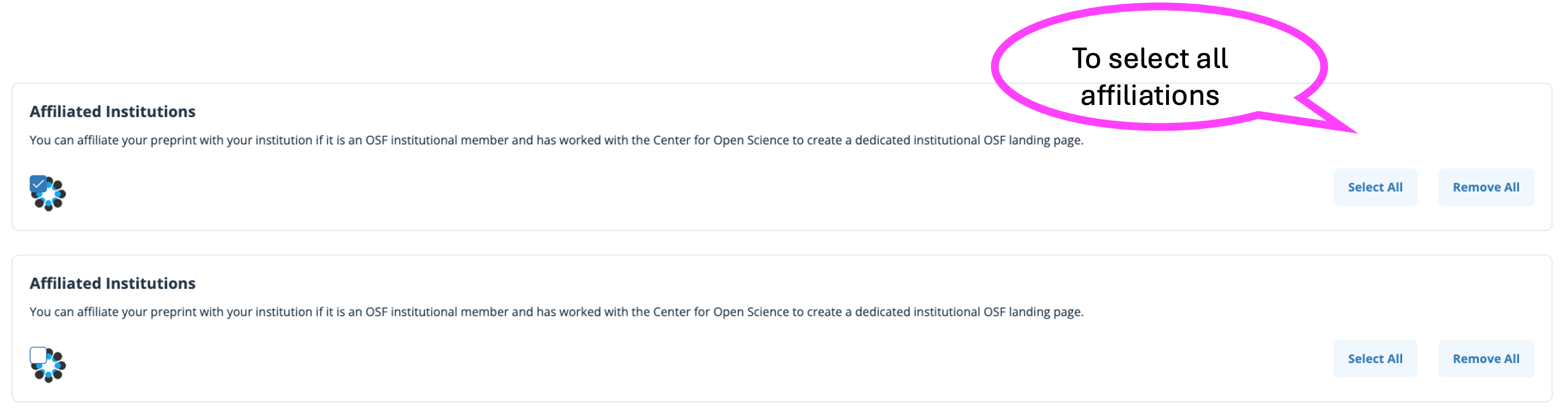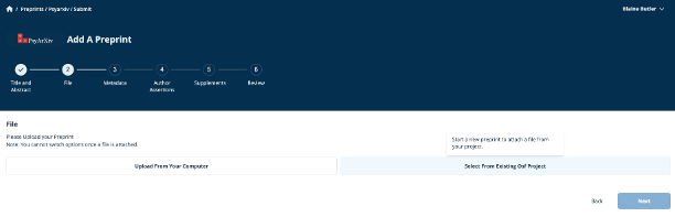 This will take you to an all-encompassing list of our preprint services. For a description, hover your cursor over the preprint service you wish to submit to. Once you have chosen which service you wish to submit to, click the “select” box.