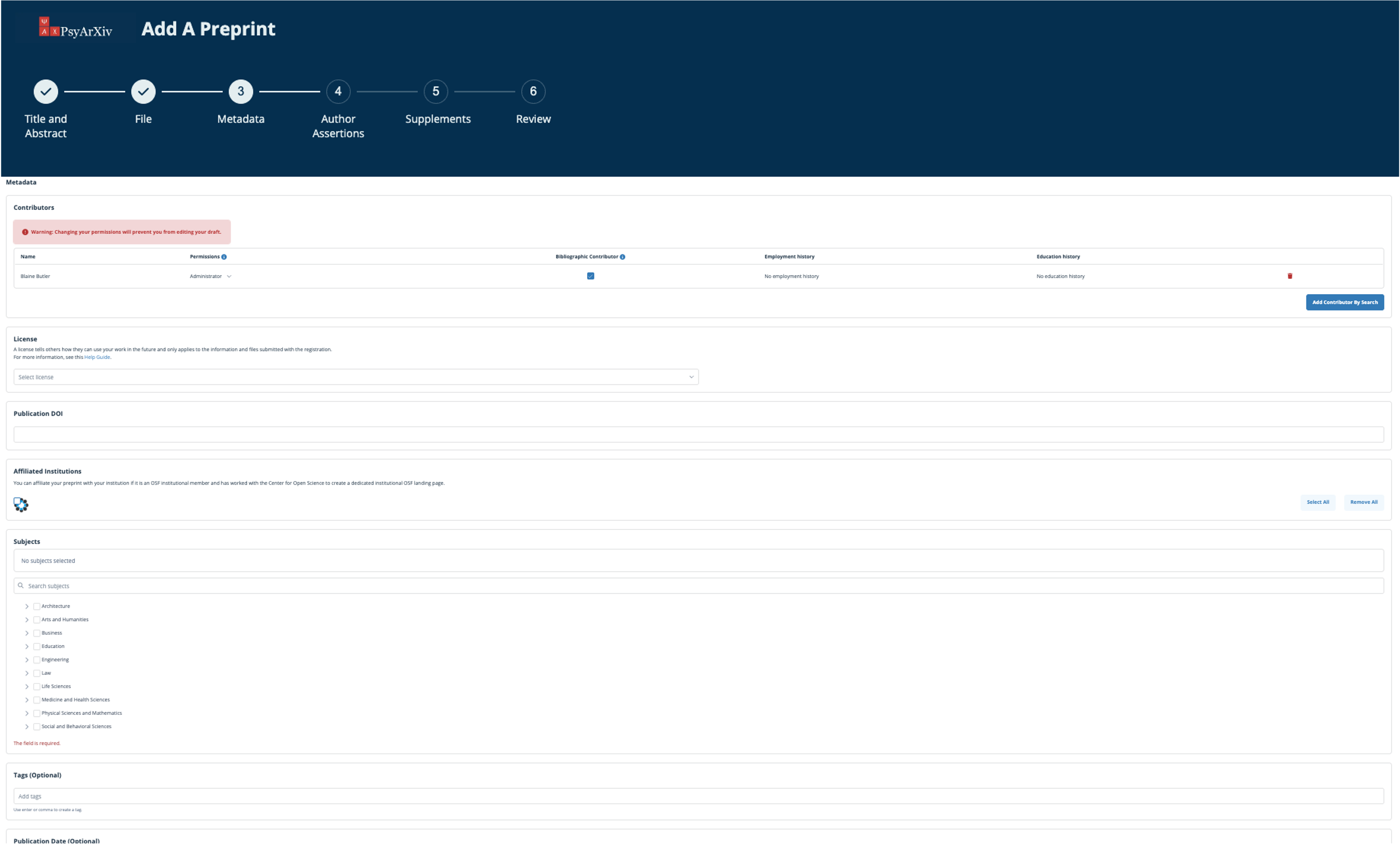 - Administrator: The contributor can view and edit the preprint, add supplemental files, and manage authors and permissions.