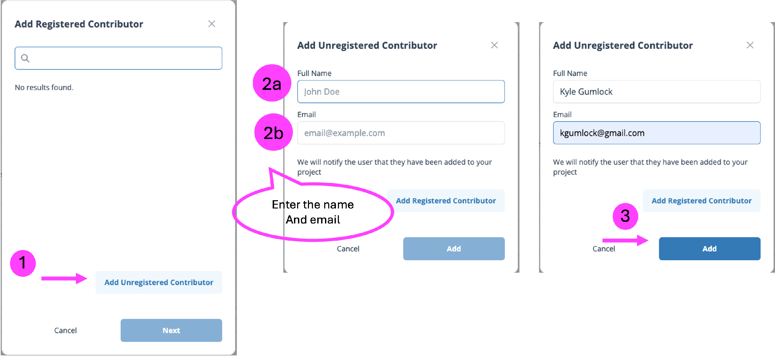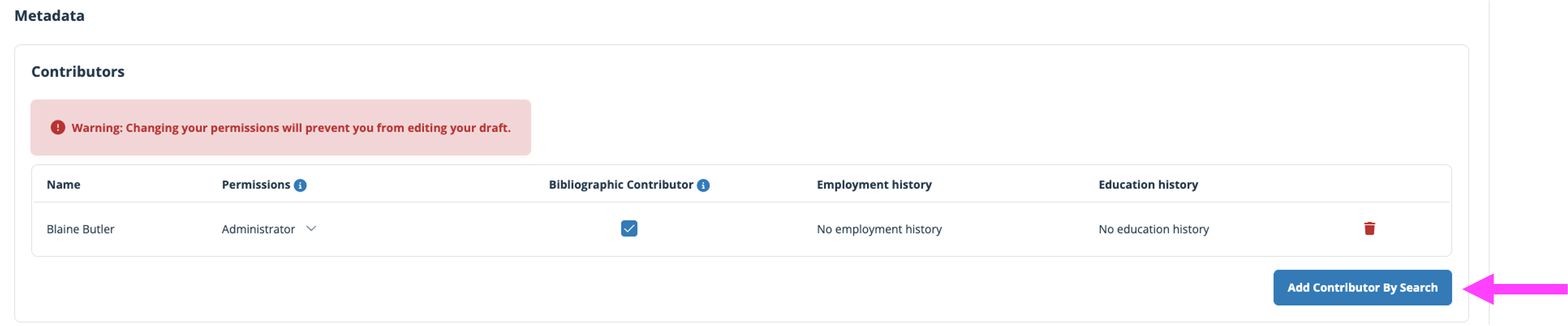If a co-author already has an account, they can be added as a registered user. Select “Add Contributor by Search”