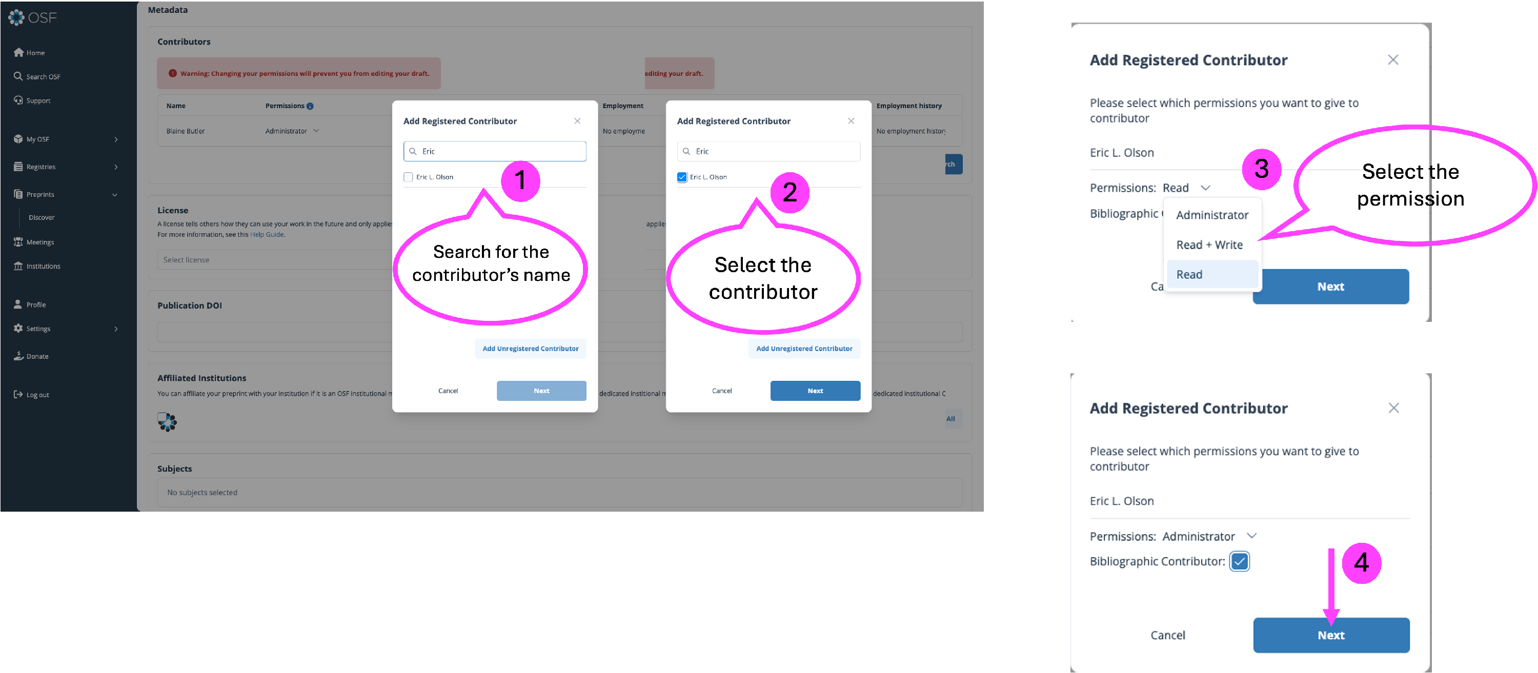 When adding contributors, they will need to be assigned specific permissions. All co-authors are given read+write permissions by default. All permission levels can be bibliographic contributors, a non-bibliographic contributor will not have their name associated with the preprint, but will maintain the granted permissions. The different levels of permissions are: