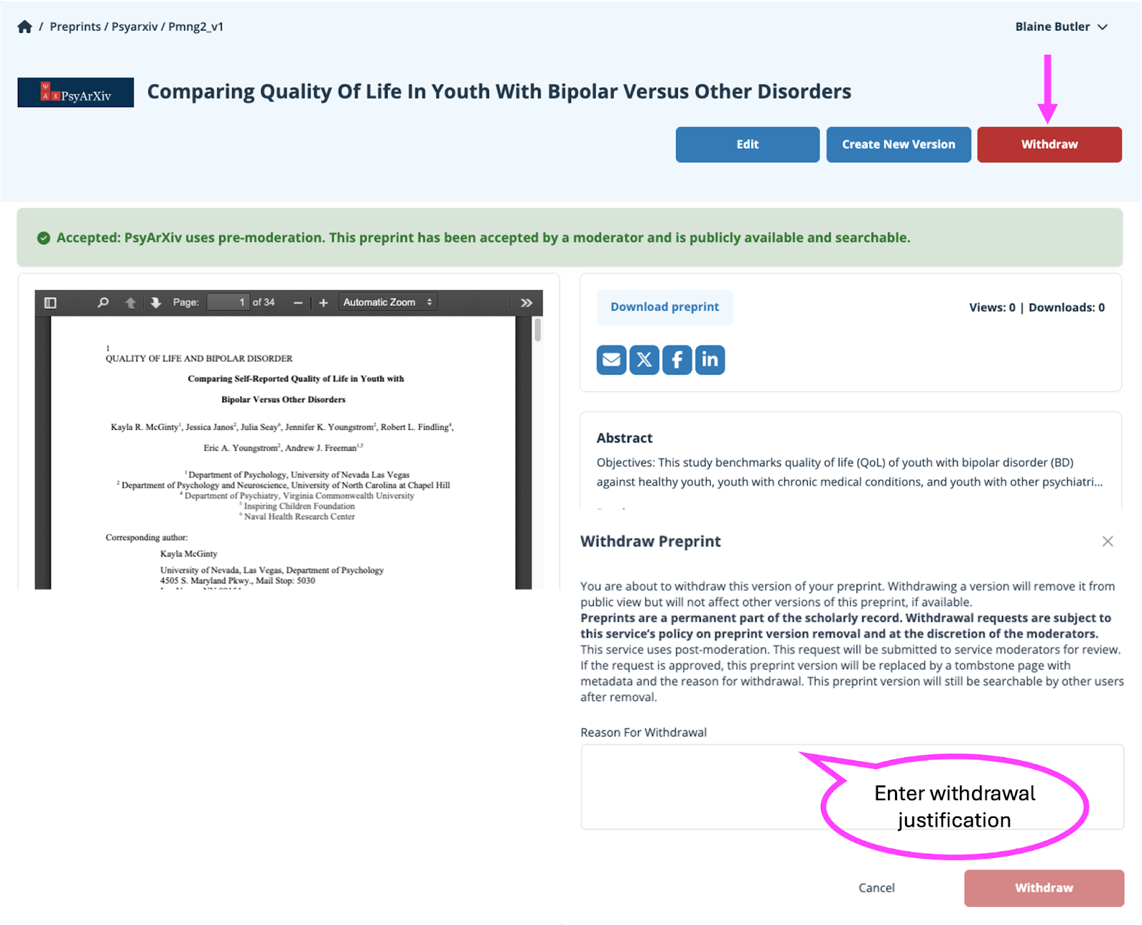 New versions of a preprint can be uploaded to OSF Preprints so that authors and the public have access to the most current version and previous versions. Preprints have persistent URLs and can be cited. Supporting data and code can be shared alongside the manuscript. How to update a preprint edit your preprint.