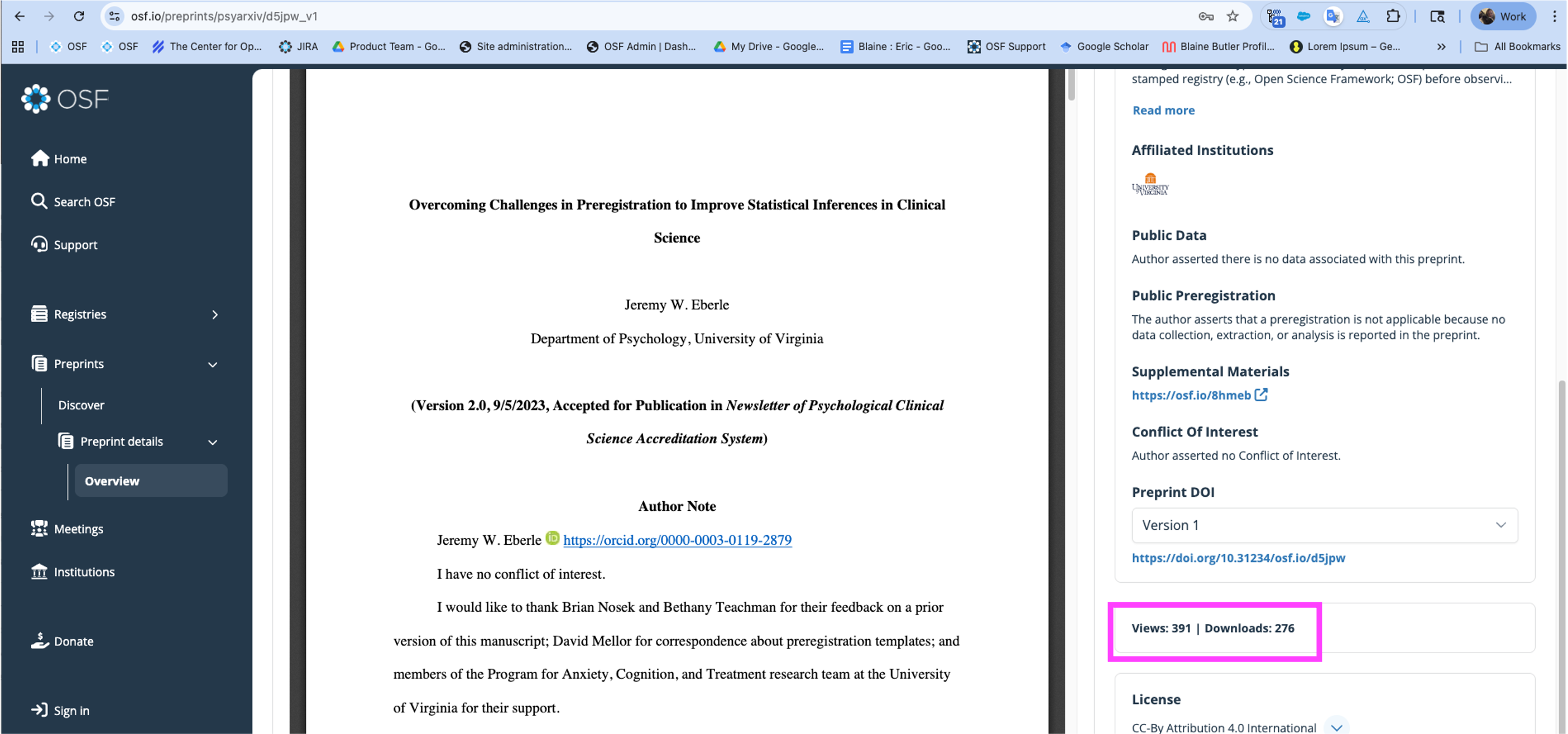 OSF Preprints is a network of community-run preprint servers that provide a platform for scholars to upload working papers, preprints, and published papers, with the option to link data and code. Preprints are generally shared through specialized preprint servers like PsyArXiv, SocArXiv, MetaArxiv, and Law Archive, offering a way to share your research quickly, receive feedback from the community, and gain a wider audience for your work. All of the community-run preprint servers on the OSF follow the same upload process and follow pre-moderation policies, where submissions are in a private, pending state until a moderator accepts or rejects them. If accepted, preprints receive a DOI and a persistent URL to allow your preprint to be cited, and the option to add supplemental files, like data or analysis scripts.