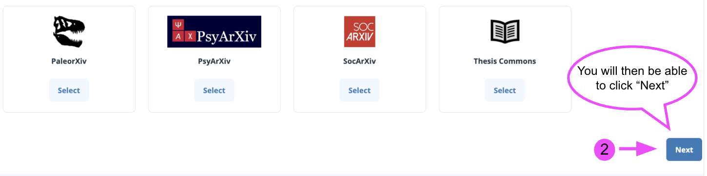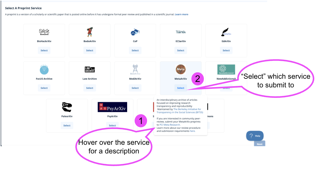 This will take you to an all-encompassing list of our preprint services. For a description, hover your cursor over the preprint service you wish to submit to. Once you have chosen which service you wish to submit to, click the “select” box.