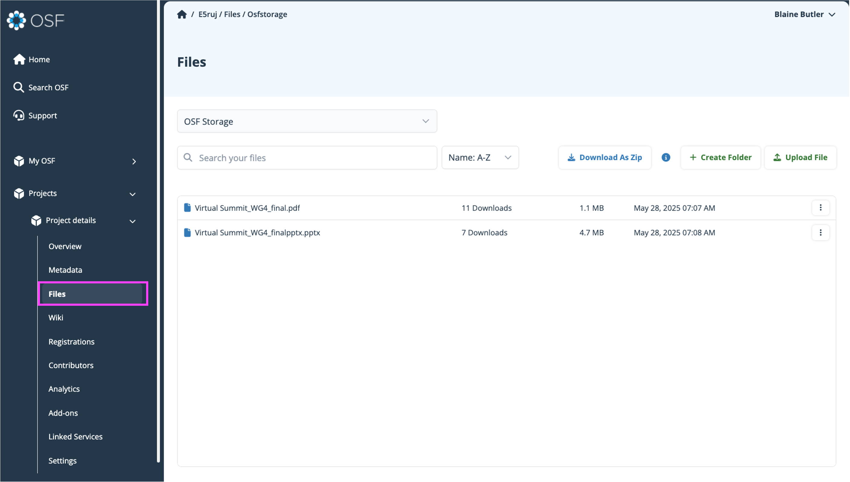 The Files section of your project is an excellent place to hold all of your data, analysis, notes and other research materials. This guide focuses on Project files. Files functionality is different for OSF Registrations and Preprints.