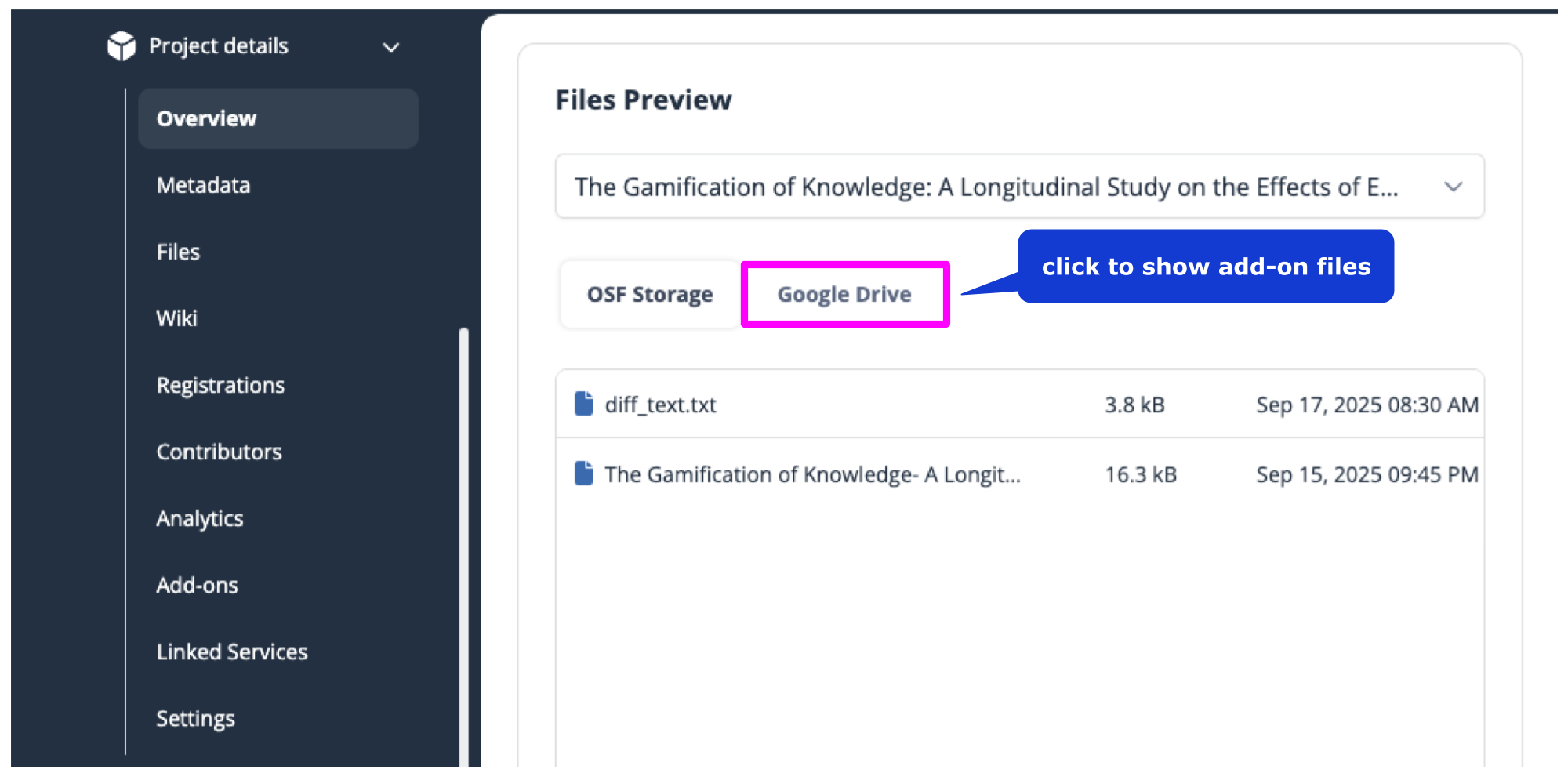 Add and display materials on your project using tools your organization/team is already using. Storage Add-ons are a great solution if your files require significant storage space or if you have a significant number of files, as space used by a connected Storage Add-on does not count towards OSF Storage usage caps.