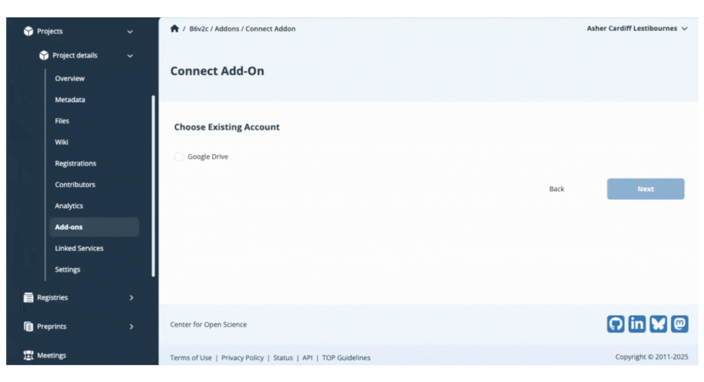 Because other contributors can connect their add-on accounts to a shared project, you'll be prompted to provide a unique name for your account.