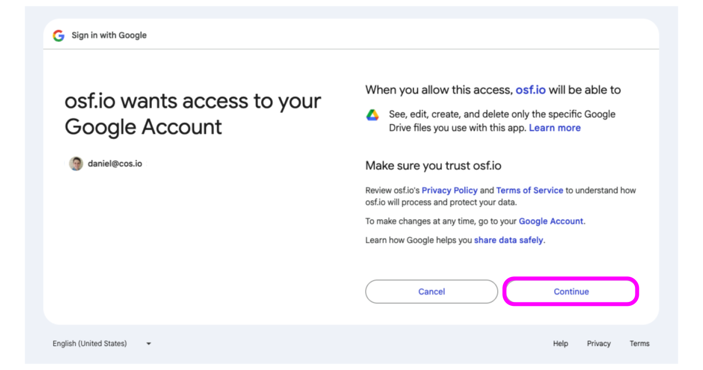 - An OSF authentication window will appear. Selecting Allow will populate a list of your OSF projects.