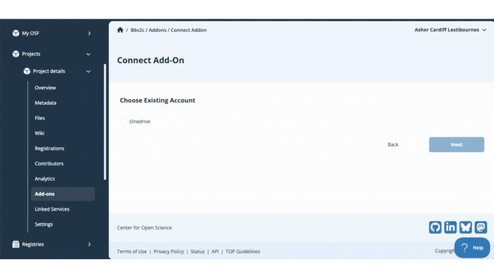 Because other contributors can connect their add-on accounts to a shared project, you'll be prompted to provide a unique name for your account. Choose a clear name like "Dataverse_YourName" to distinguish your connection from other collaborators'.